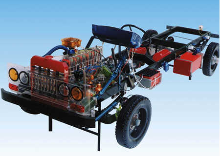 本品選用透明有機玻璃制作,內中部件均以硬質塑料料加工,用 螺絲固定在金屬高溫烘漆而成的車架上。各總成部分都以壓模成形加 工,代替過去膠粘合的方法,使產(chǎn)品在強度上有很大提高。發(fā)動機總成用電機驅動,在油門處設有調速裝置,能演示發(fā)動機轉速高低。離合器分離明顯,操縱靈活,離合器外殼整體壓模而成,變速箱和各檔齒輪用各種顏色表示,換檔靈活,手制動美觀。后橋外形壓模而成,內中主減速、差速轉動自如,輪轂剎蹄壓模成型,剎蹄可調節(jié),前橋輪鼓可調整,轉向裝置以及電瓶、油箱、水箱,制動管路分布清楚一目了然。電路采用對插件前后分布,燈架、風窗、儀表板、后燈架用透明有機玻璃壓模成整體美觀逼真。