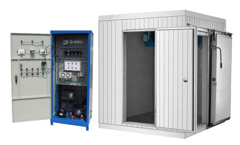 實訓裝置主要由控制柜、水冷制冷機組、高溫拼裝式冷庫,低溫拼裝式冷庫、主機實訓模塊、連軸式冷卻水泵,冷卻塔,溫度和壓力傳感器等組成。